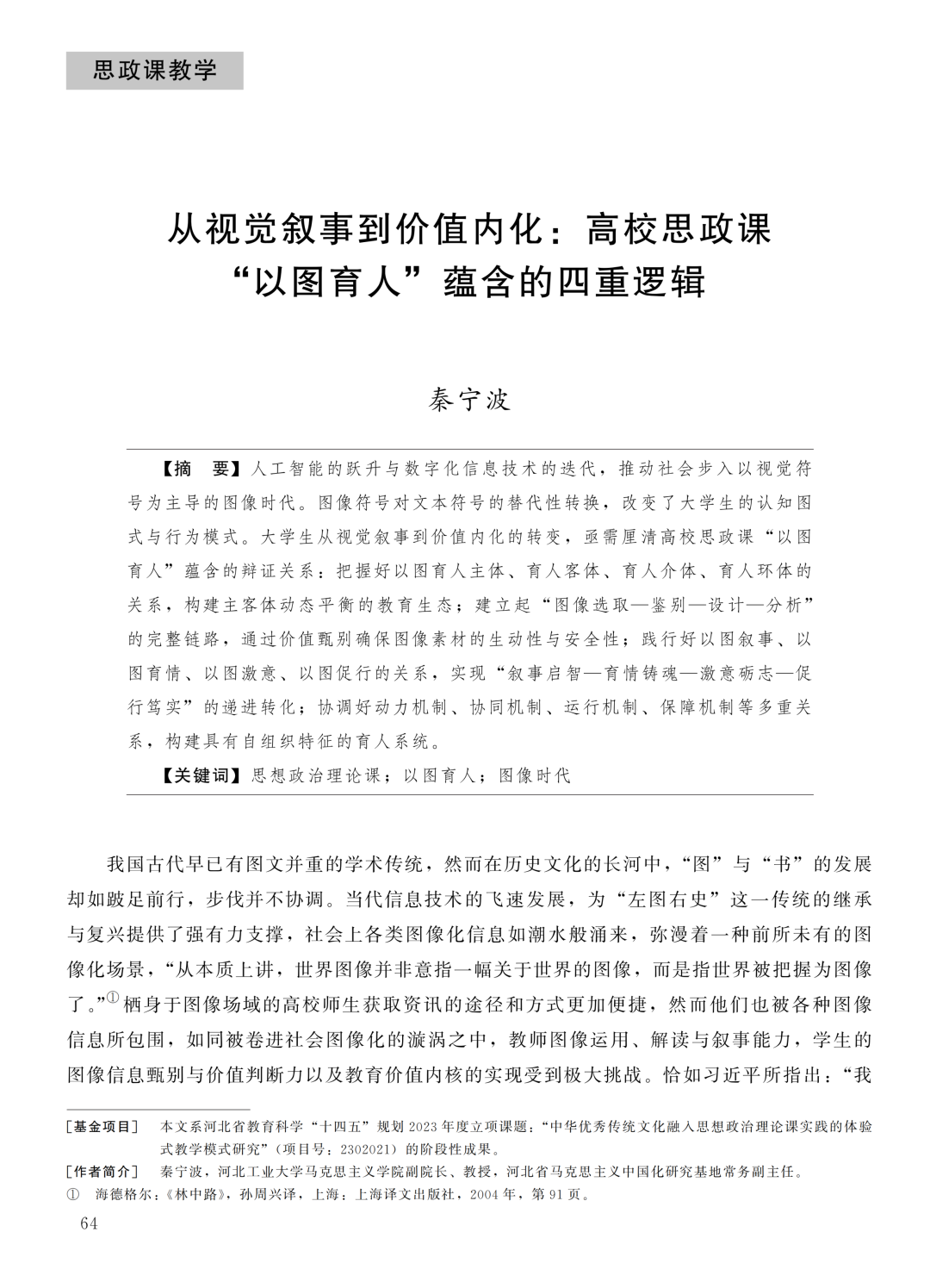 摘要:人工智能的跃升与数字化信息技术的迭代,推动社会步入以视觉符号为主导的图像时代。图像符号对文本符号的替代性转换,改变了大学生的认知图式与行为模式。大学生从视觉叙事到价值内化的转变,亟需厘清高校思政课“以图育人”蕴含的辩证关系:把握好以图育人主体、育人客体、育人介体、育人环体的关系,构建主客体动态平衡的教育生态;建立起“图像选取—鉴别—设计—分析”的完整链路,通过价值甄别确保图像素材的生动性与安全性;践行好以图叙事、以图育情、以图激意、以图促行的关系,实现“叙事启智—育情铸魂—激意砺志—促行笃实”的递进转化;协调好动力机制、协同机制、运行机制、保障机制等多重关系,构建具有自组织特征的育人系统。